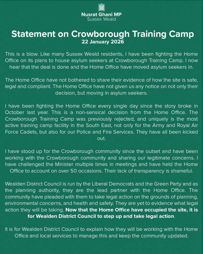 The use of the Crowborough camp has been the subject of months of opposition locally, with residents and campaigners raising concerns about the impact on public services, infrastructure and community cohesion. Protests have taken place in the town, and local representatives have repeatedly questioned how the plans have been developed and communicated.